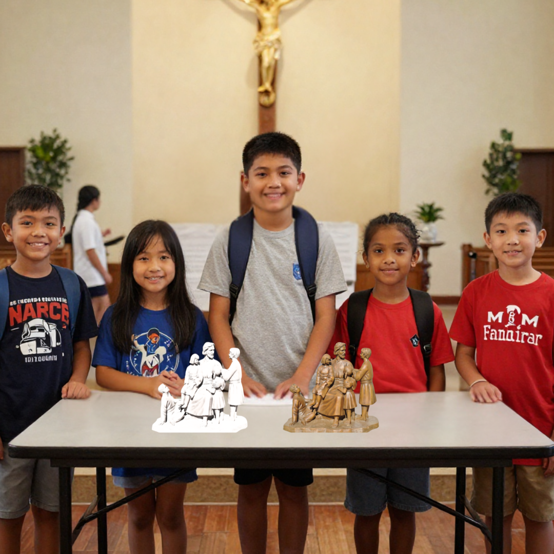 The sculpture is available in several sizes to accommodate different spaces and needs. Life-sized versions create a powerful visual impact, perfect for placement in church courtyards or as a focal point in community gardens. Half life-sized sculptures are ideal for more intimate settings such as private Christian schools or Catholic parishes. Additionally, 12” miniature replicas crafted in white resin stone present an affordable and accessible option, serving as a meaningful fundraising tool for Catholic youth initiatives.