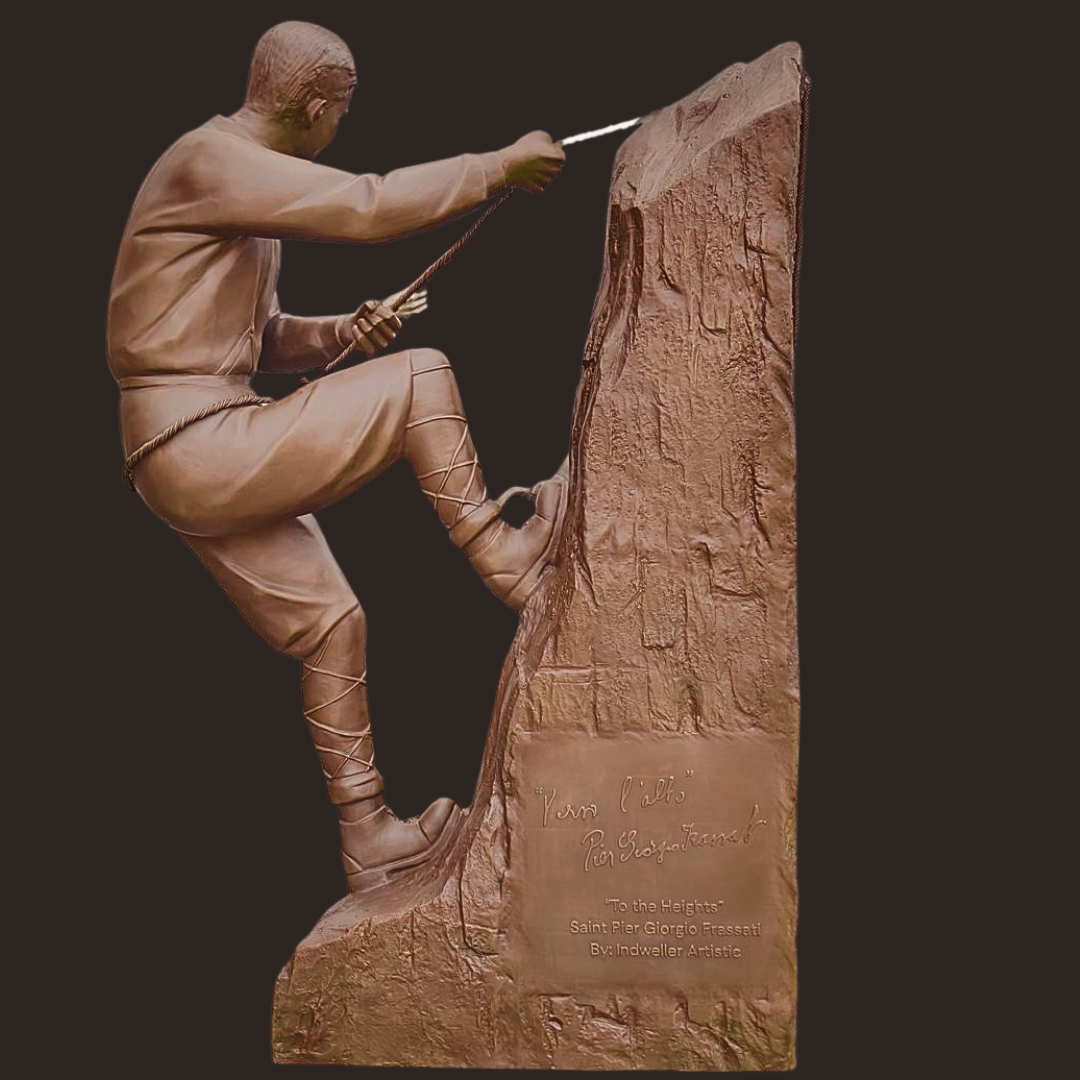 In the heart of sacred and liturgical art, a remarkable bronze sculpture stands as a testament to the enduring spirit of a modern-day saint. Titled “Verso l’alto” (“To the Heights”) by Indweller Artistic, this piece captures the essence of St. Pier Giorgio Frassati, a newly canonized Catholic saint whose life continues to inspire young Catholics around the world. This contemporary depiction not only immortalizes Frassati’s physical journeys up the mountains he so loved but also symbolizes his spiritual ascent toward closeness with God.