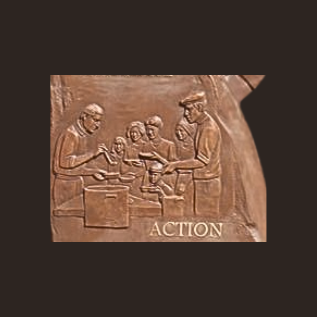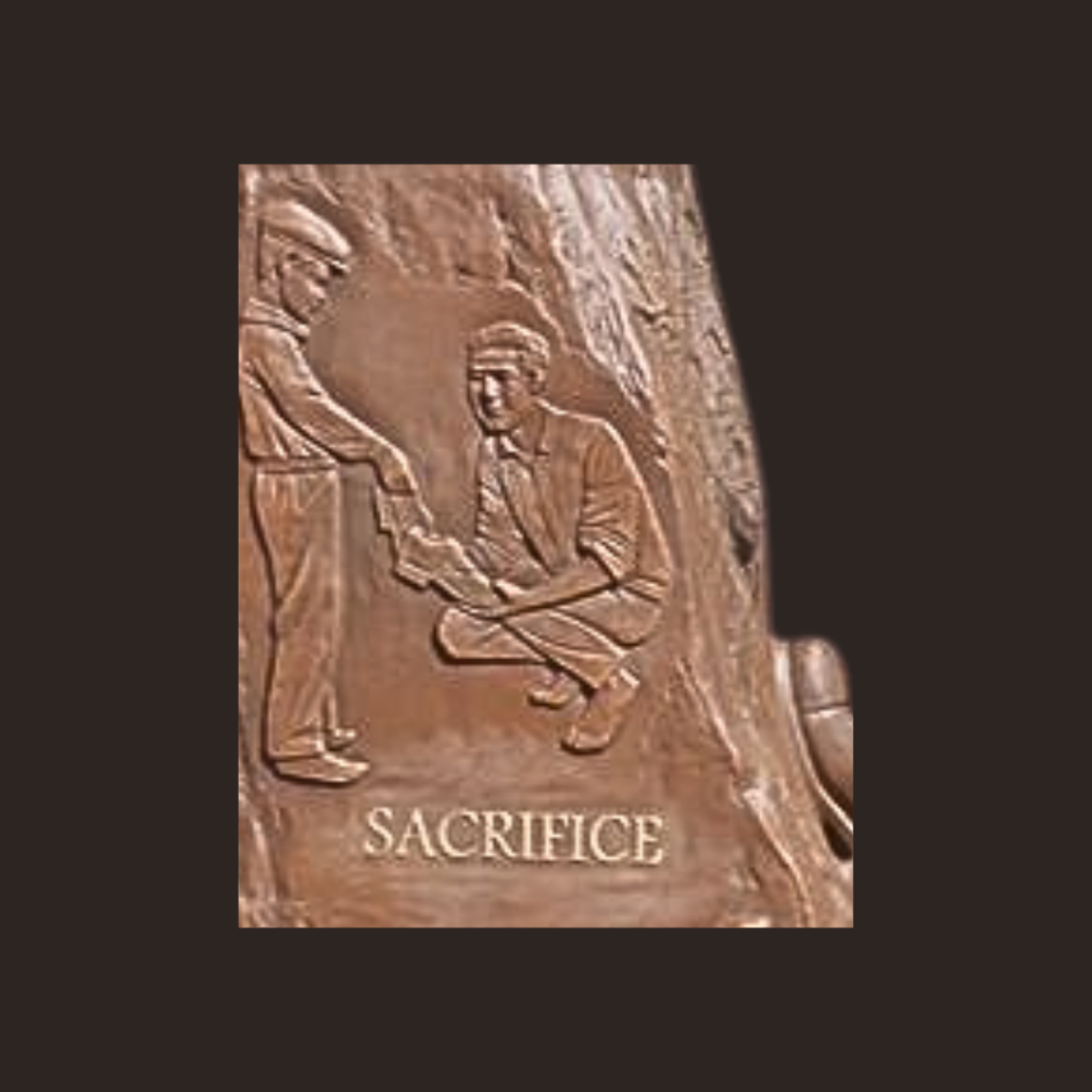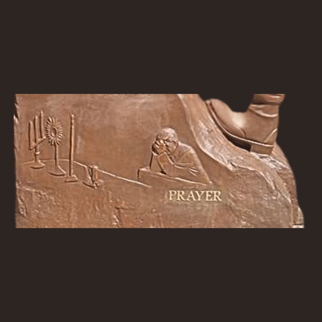 One of the most striking features of “Verso l’alto” is its narrative depth. Etched into the side of the mountain are scenes from Frassati’s life, each one a testament to the values he cherished. We see Pier Giorgio praying before the Blessed Sacrament, serving the poor of Turin and giving the shoes off of his own feet to someone in need. Words like “Prayer,” “Service,” and “Sacrifice” are carved into the surface, representing the three pillars upon which he built his spiritual ascent. These elements invite viewers to reflect on their own lives and consider how they might embody these virtues in their personal journeys.