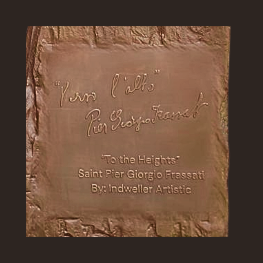 Adding a personal touch to this already compelling piece, the back of the sculpture features St. Frassati’s actual handwriting of the words “Verso l’alto.” This detail connects viewers more intimately with the saint, emphasizing the personal nature of his faith journey. It serves as a reminder that our spiritual ascent is uniquely our own, yet deeply connected to the examples set by saints like Frassati.